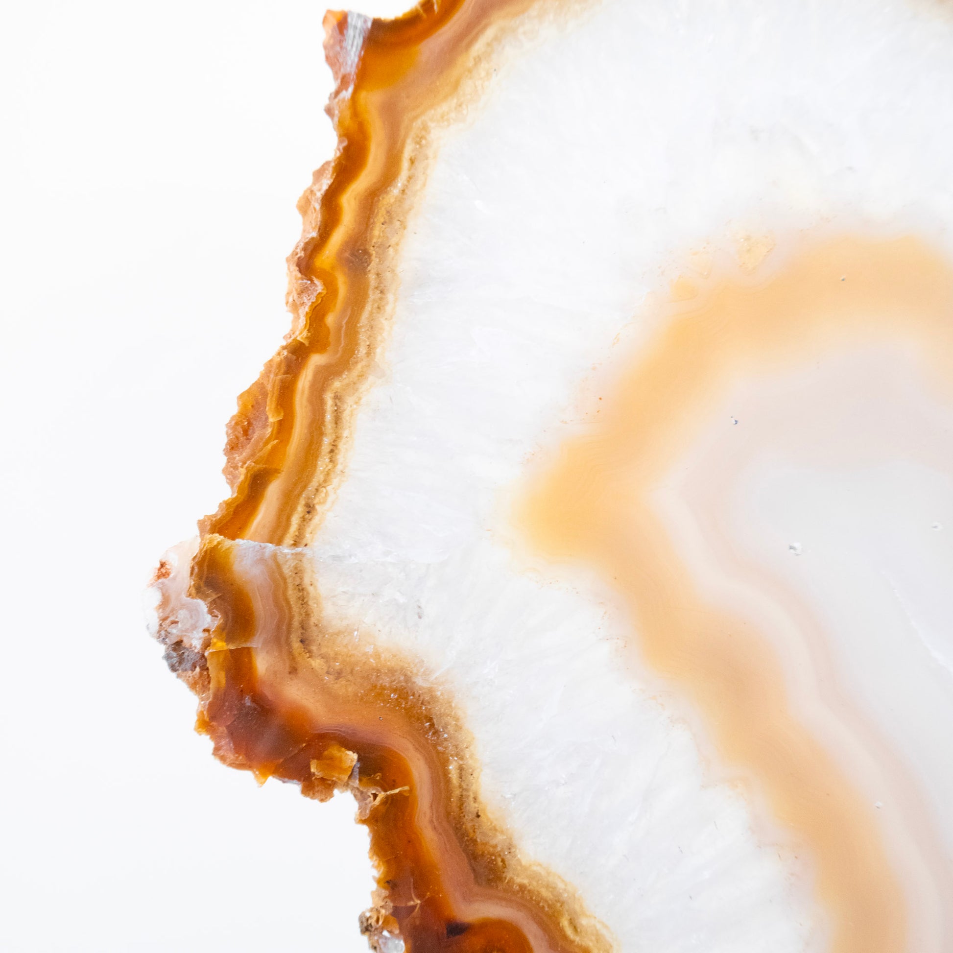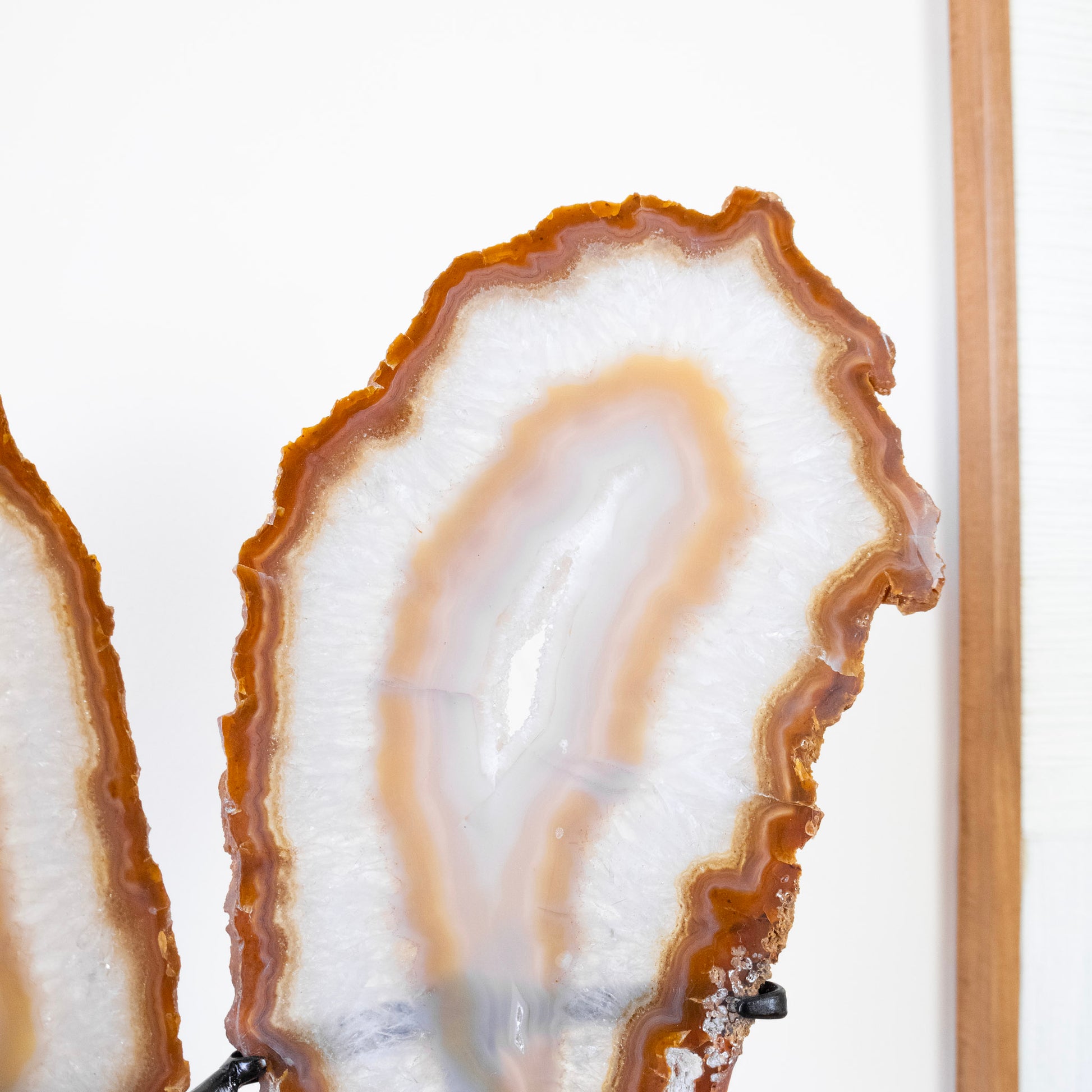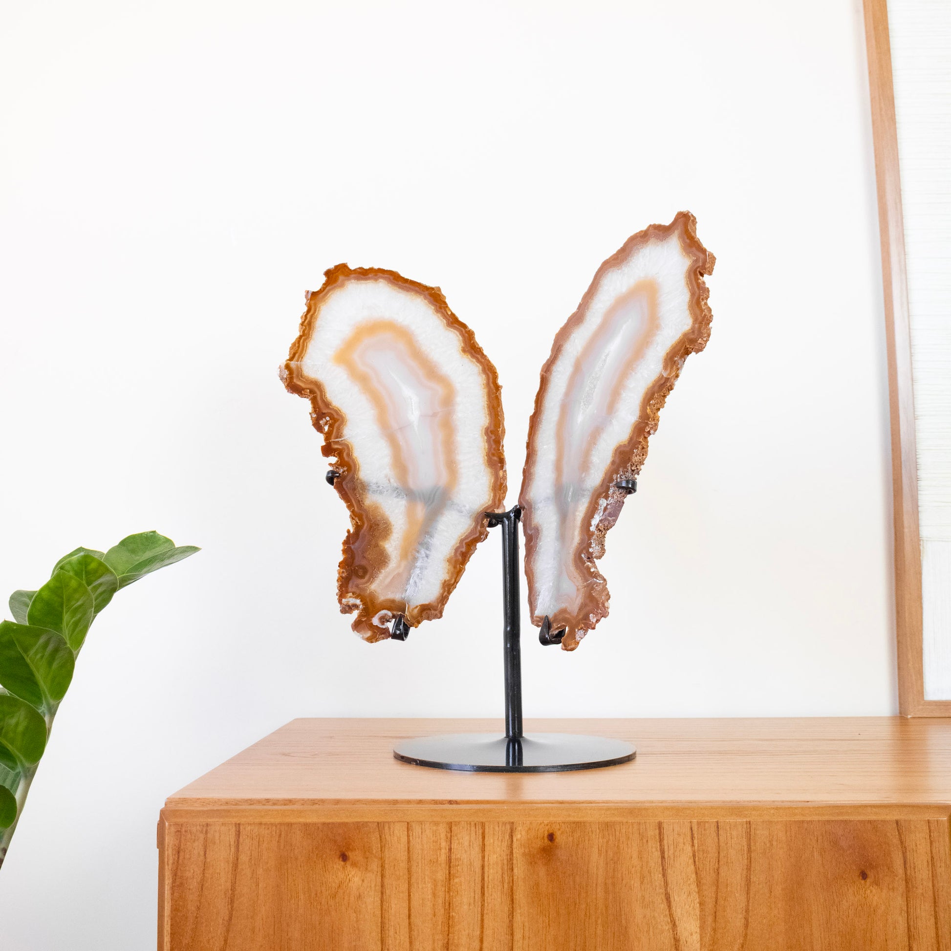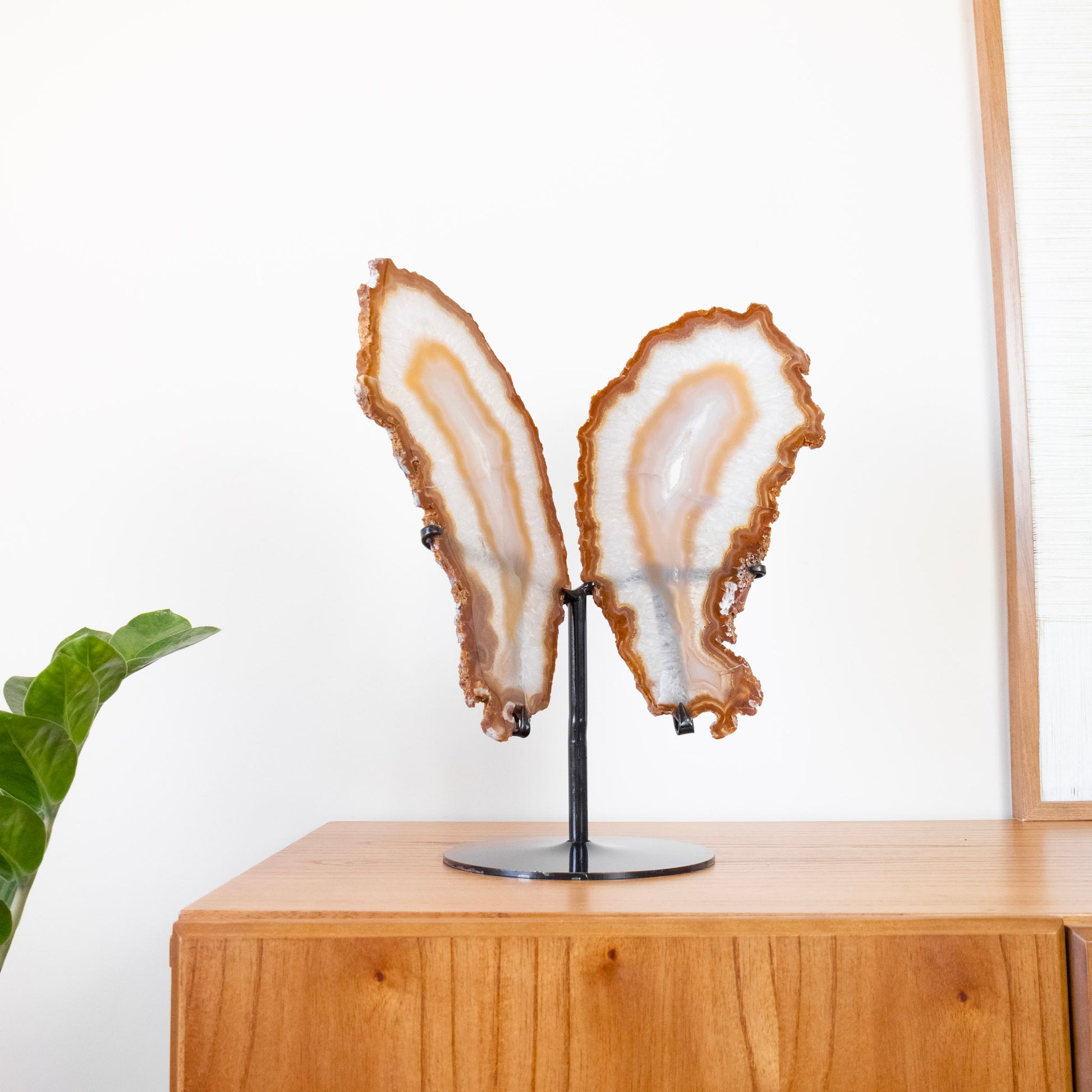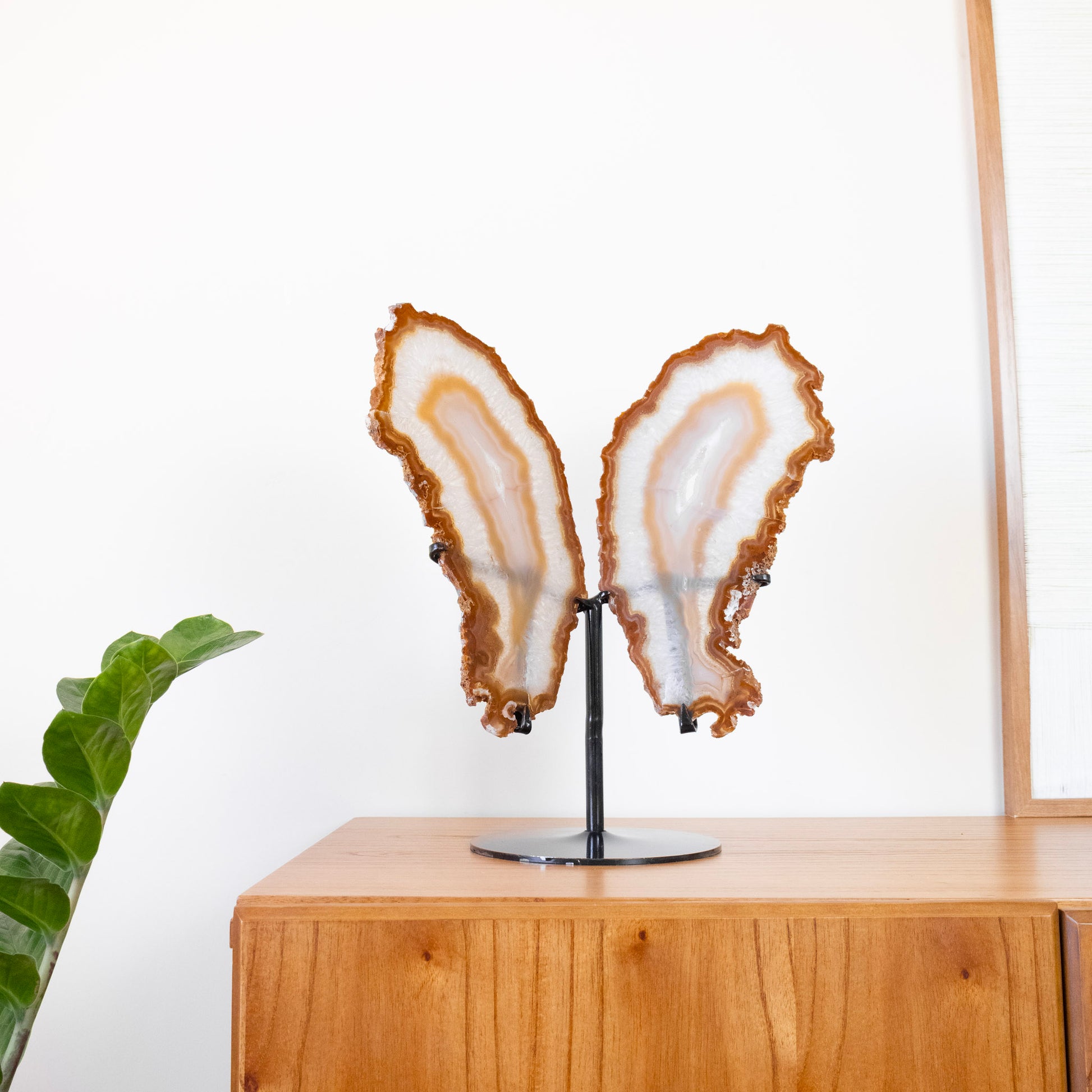 Montada sobre base metálica que realça seus reflexos dourados, cada curva desta borboleta revela os veios únicos da Ágata, criando um jogo de luz e transparência. Peça exclusiva para quem busca decoração com alma, onde o luxo mineral encontra o simbolismo transformador.