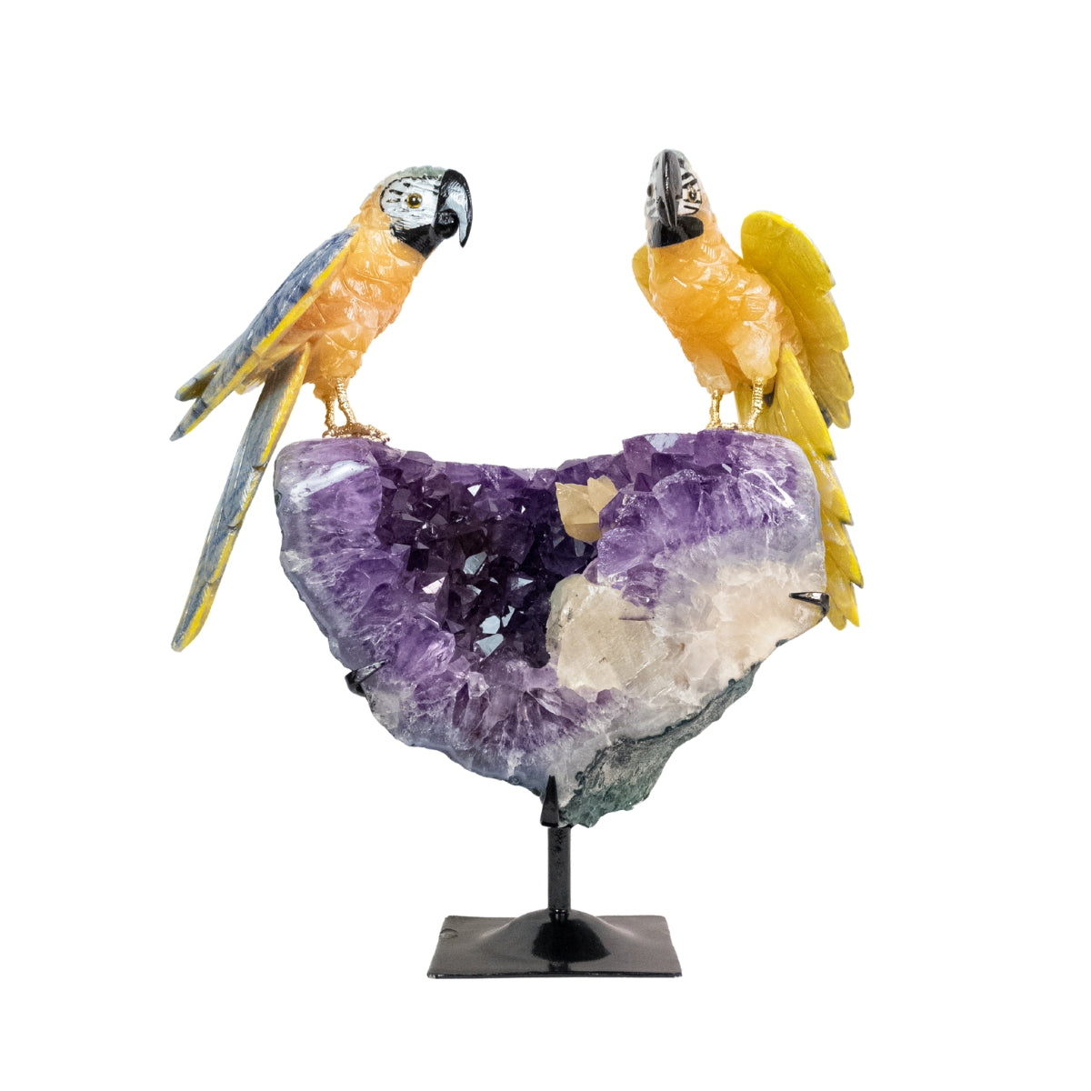Casal de Araras na Drusa de Ametista com Inclusão de Calcita na Base Metal 5,780 Kg