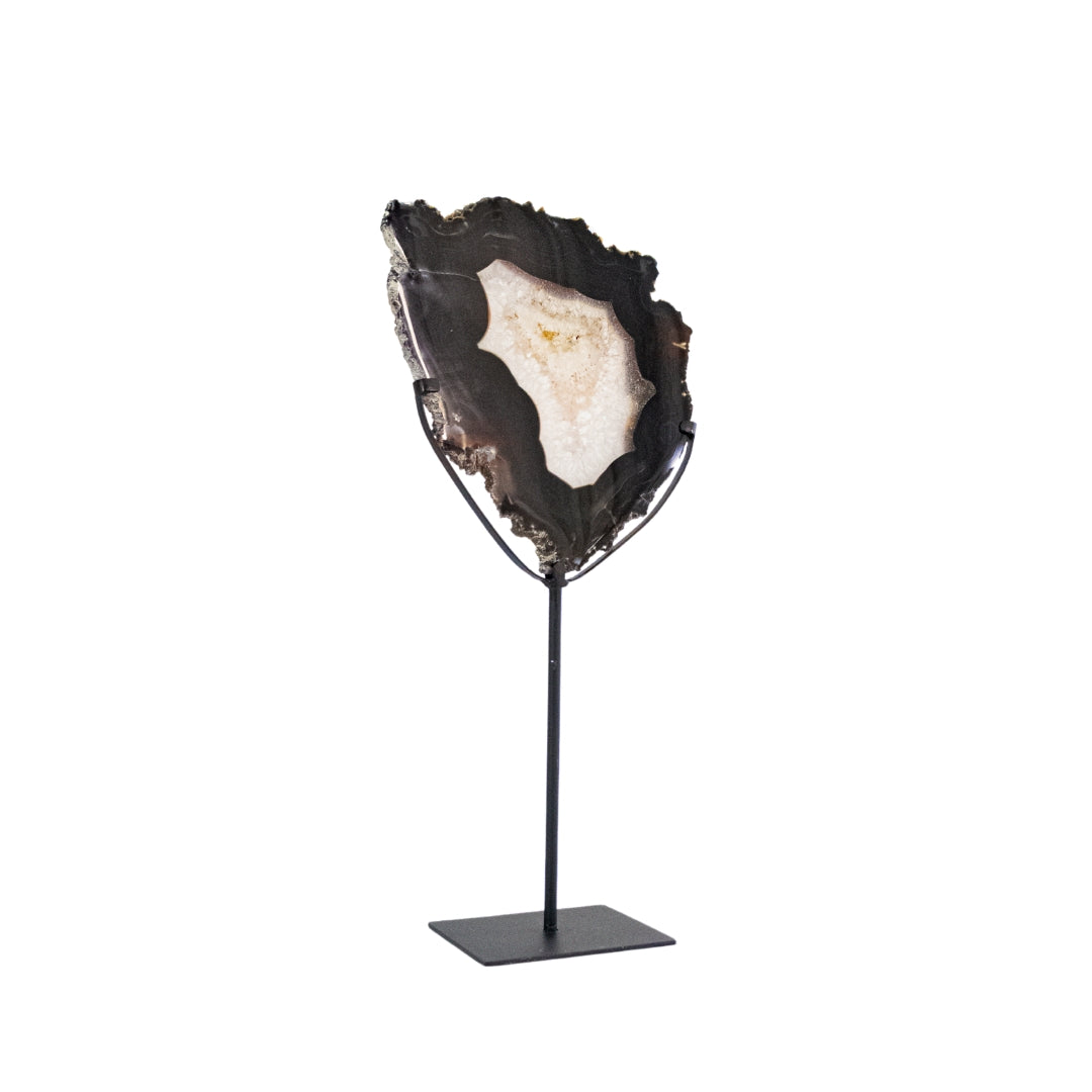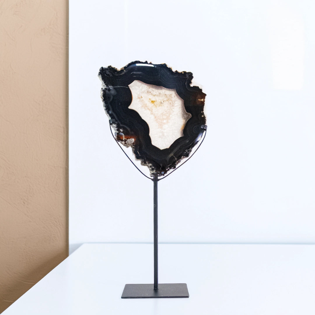 Esta deslumbrante chapa de Ágata revela as fascinantes camadas formadas pela sabedoria da Terra ao longo dos séculos. Sobre a base metal preta, suas propriedades energéticas se potencializam: