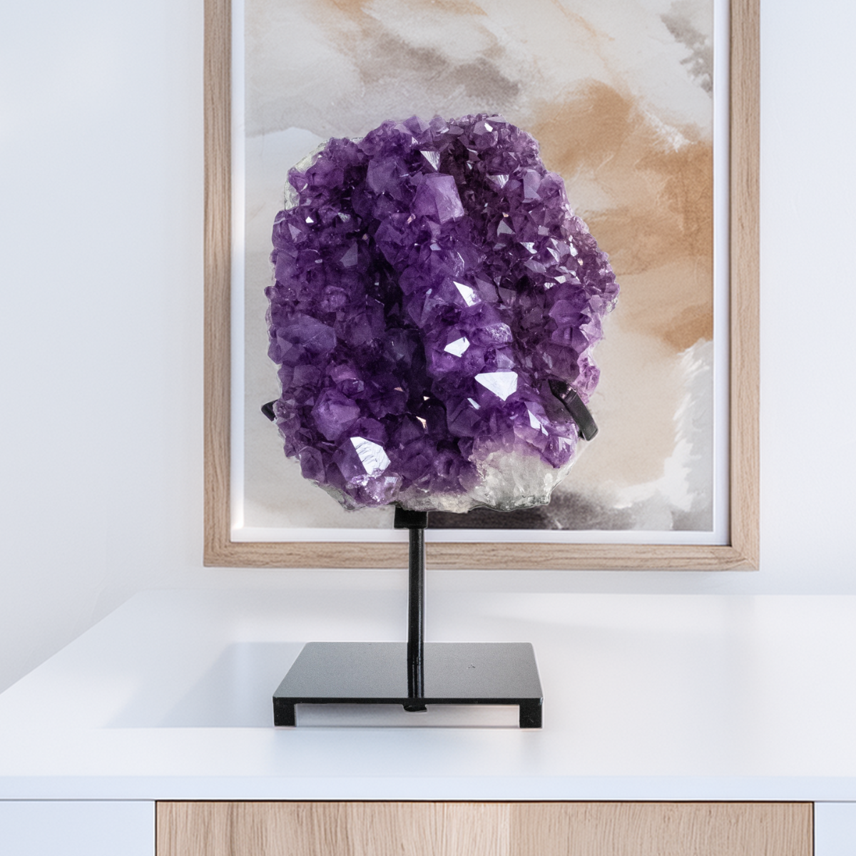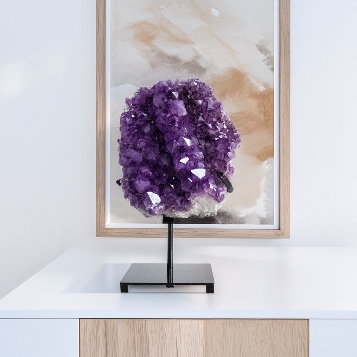 A Drusa de Ametista Extra com Base em Metal Preto é mais do que um enfeite: é uma peça que traz beleza, harmonia e um pouco da magia da natureza para o seu dia a dia. Ideal para quem valoriza o que é autêntico e cheio de significado.