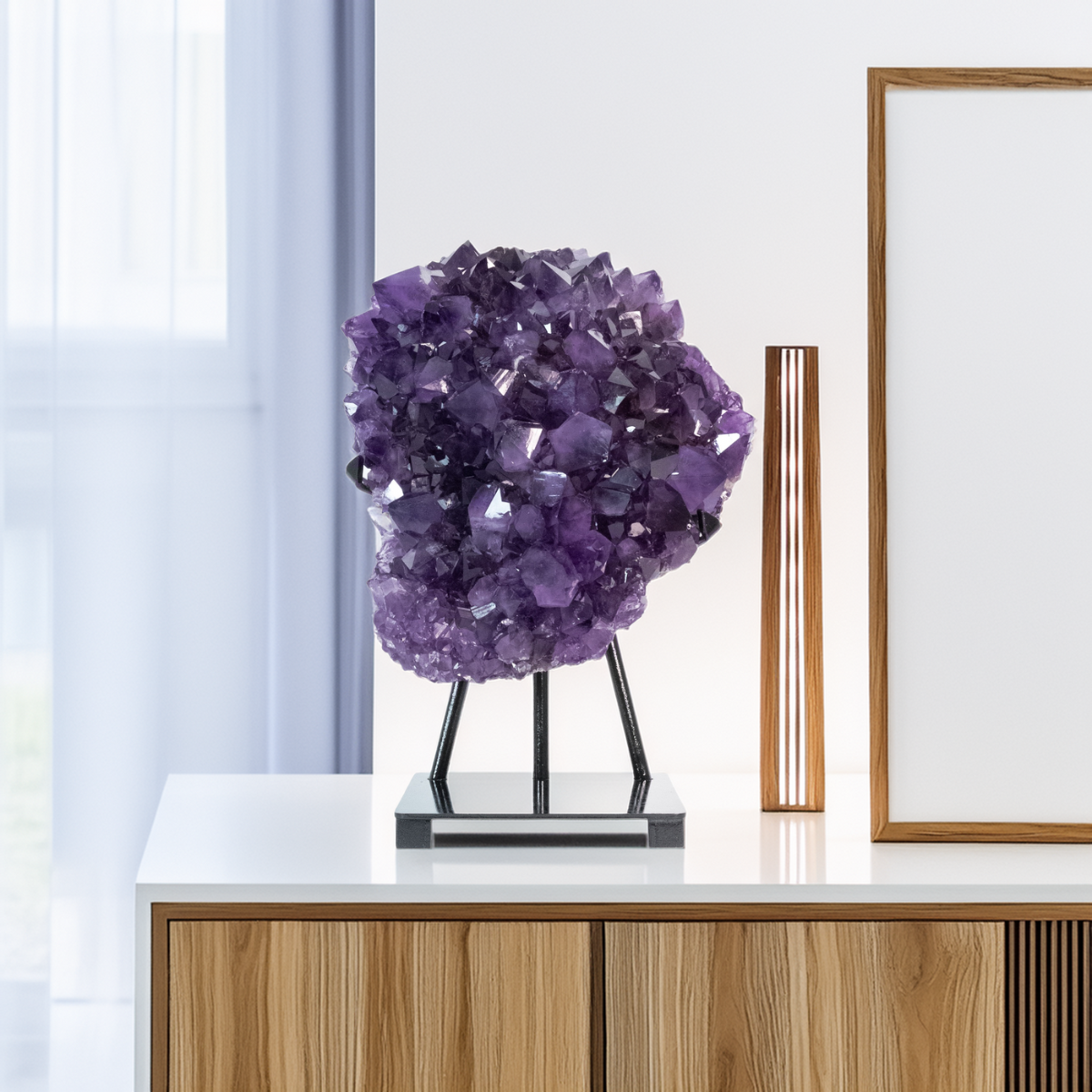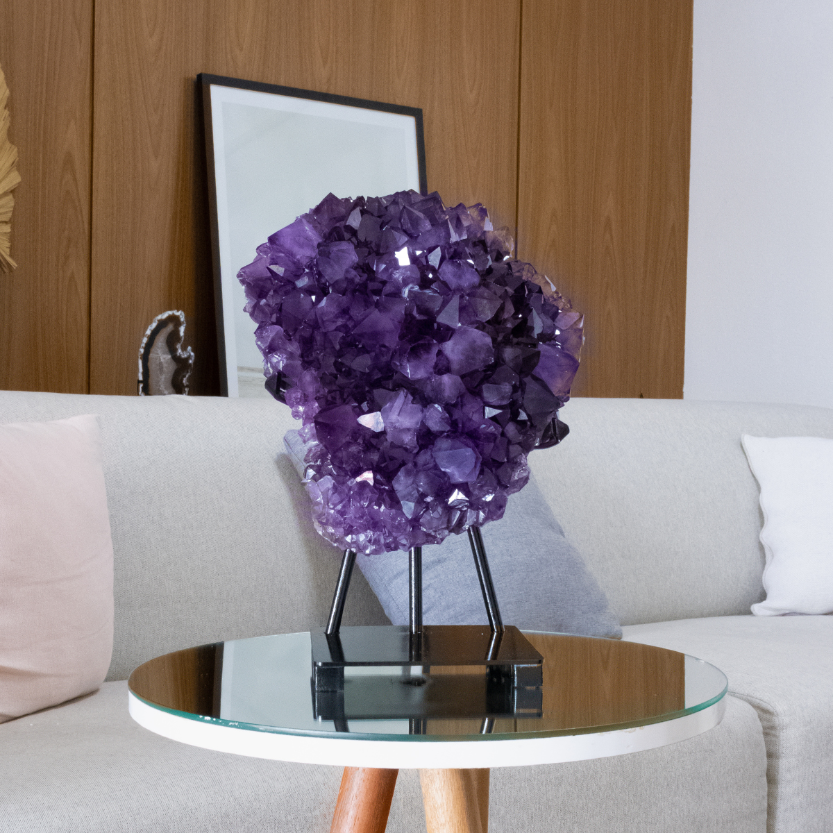 A Drusa de Ametista Extra com Base em Metal Preto é mais do que um enfeite: é uma peça que traz beleza, harmonia e um pouco da magia da natureza para o seu dia a dia. Ideal para quem valoriza o que é autêntico e cheio de significado.