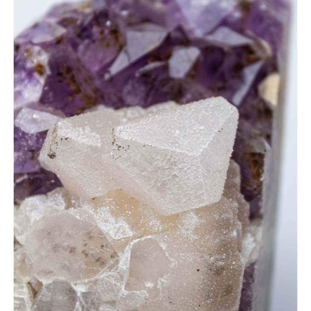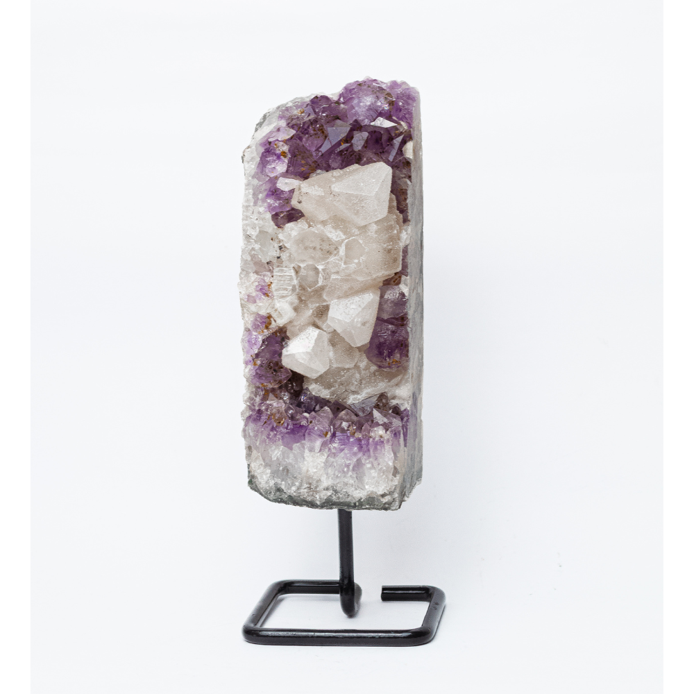 Drusa de Ametista com Calcita Cristalizada na Base 1,385kg: pedra que promove a paz, transformação e sabedoria.