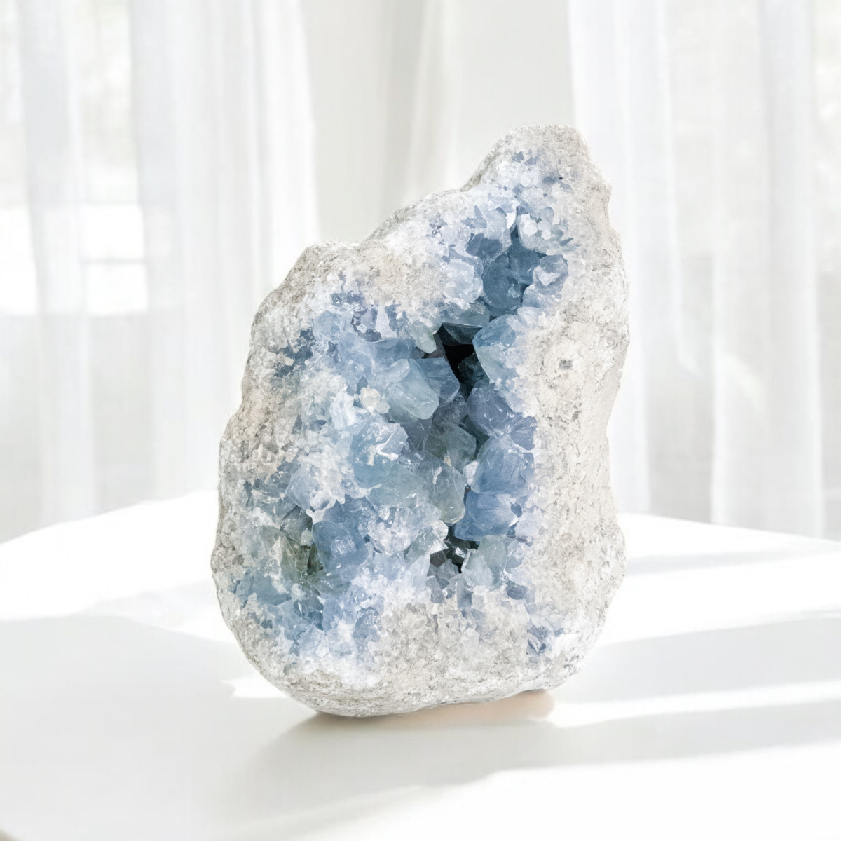 Celestita - Pedra de elevação elevada, é uma Mestra da Nova Era. Imbuídas de energias divinas, ela inspira em nós a paz infinita do mundo espiritual e o contato com o reino angélico. Nos impulsiona a buscar a iluminação. Trata-se de uma pedra muito útil para estimular a comunicação clarividente.
