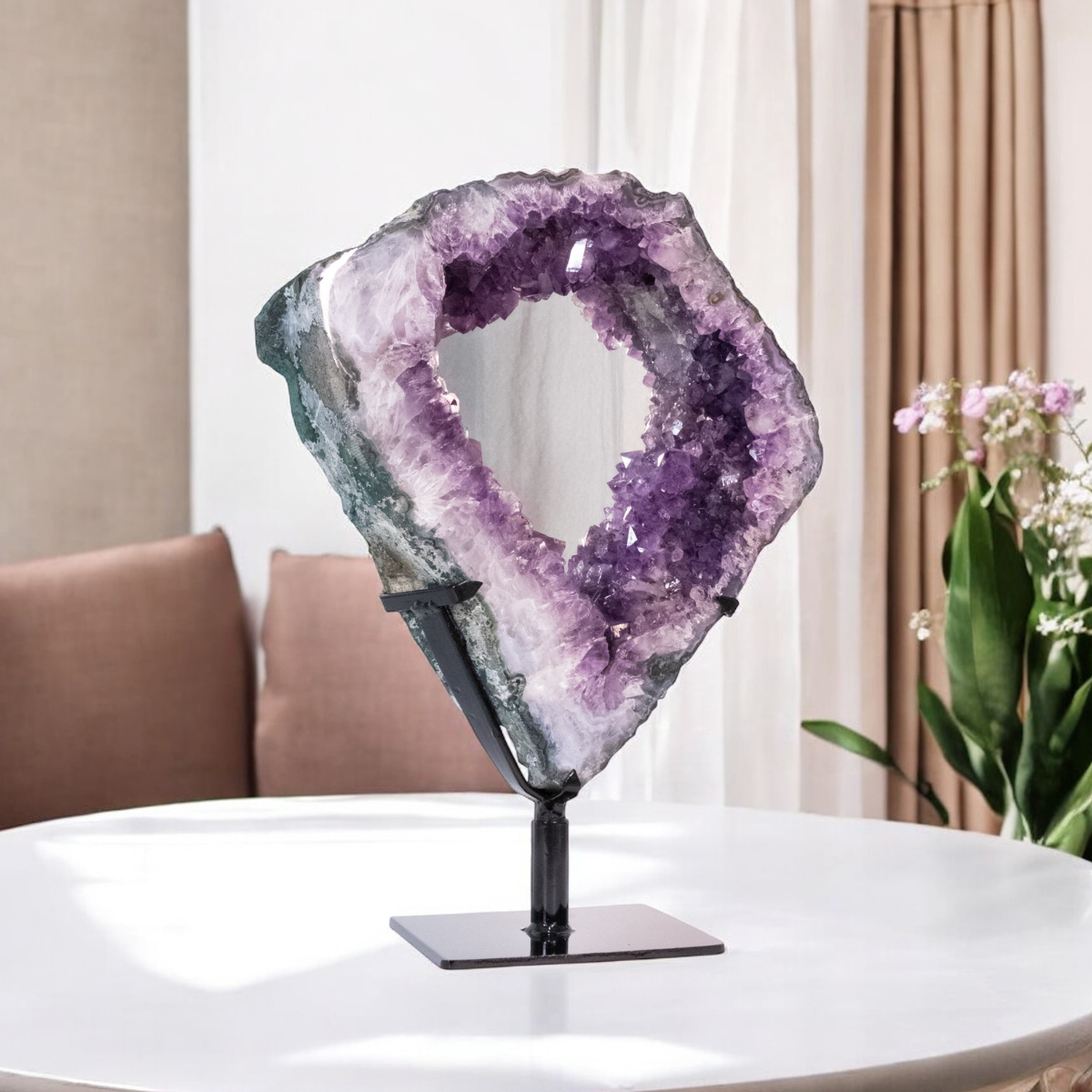 Energização e Bem-Estar: A ametista é conhecida por suas propriedades que promovem a tranquilidade, o equilíbrio emocional e a purificação de ambientes. Ter uma drusa de ametista em seu espelho não só embeleza o espaço, mas também contribui para um ambiente mais harmonioso.