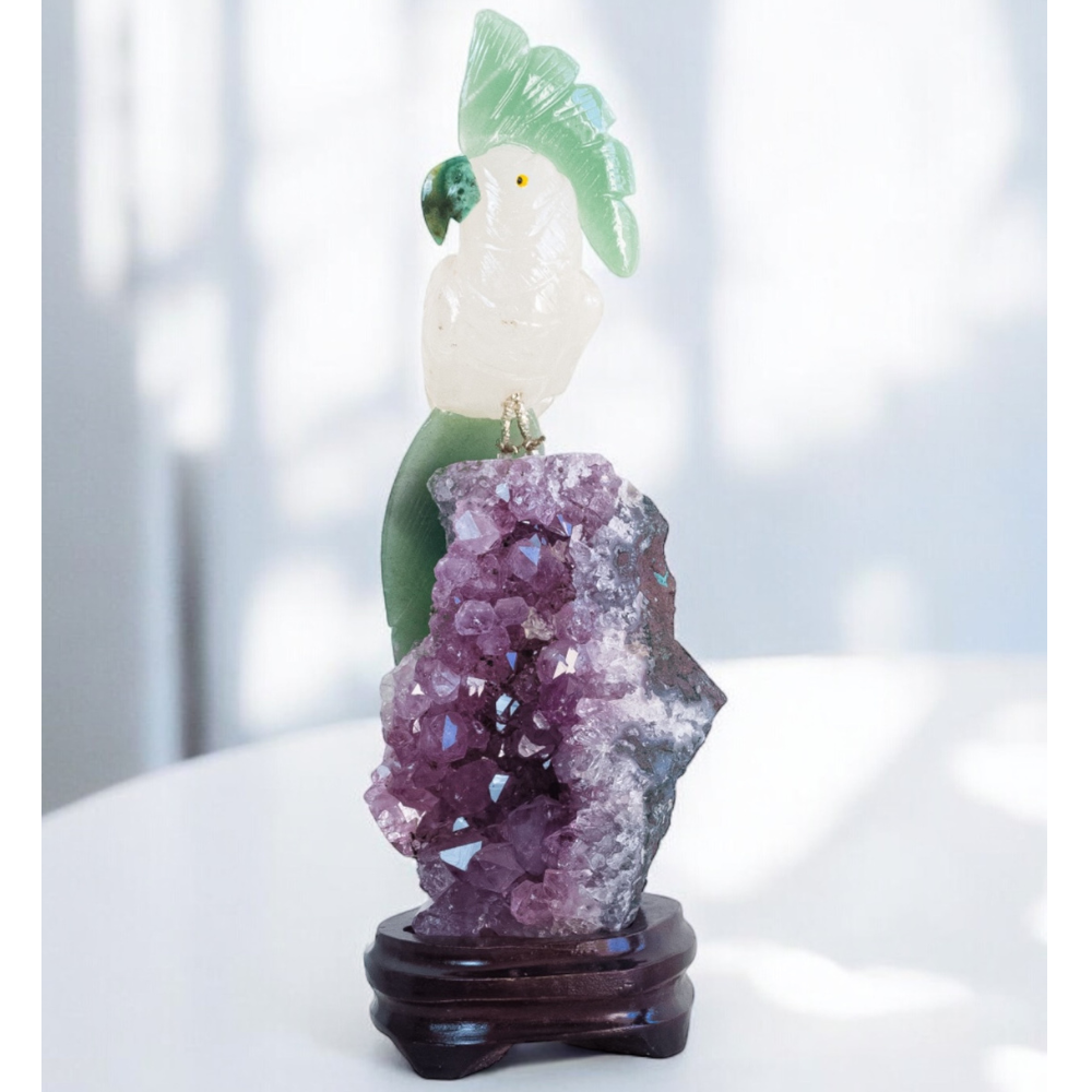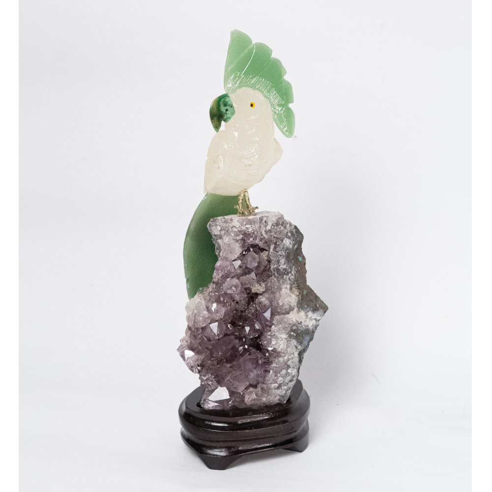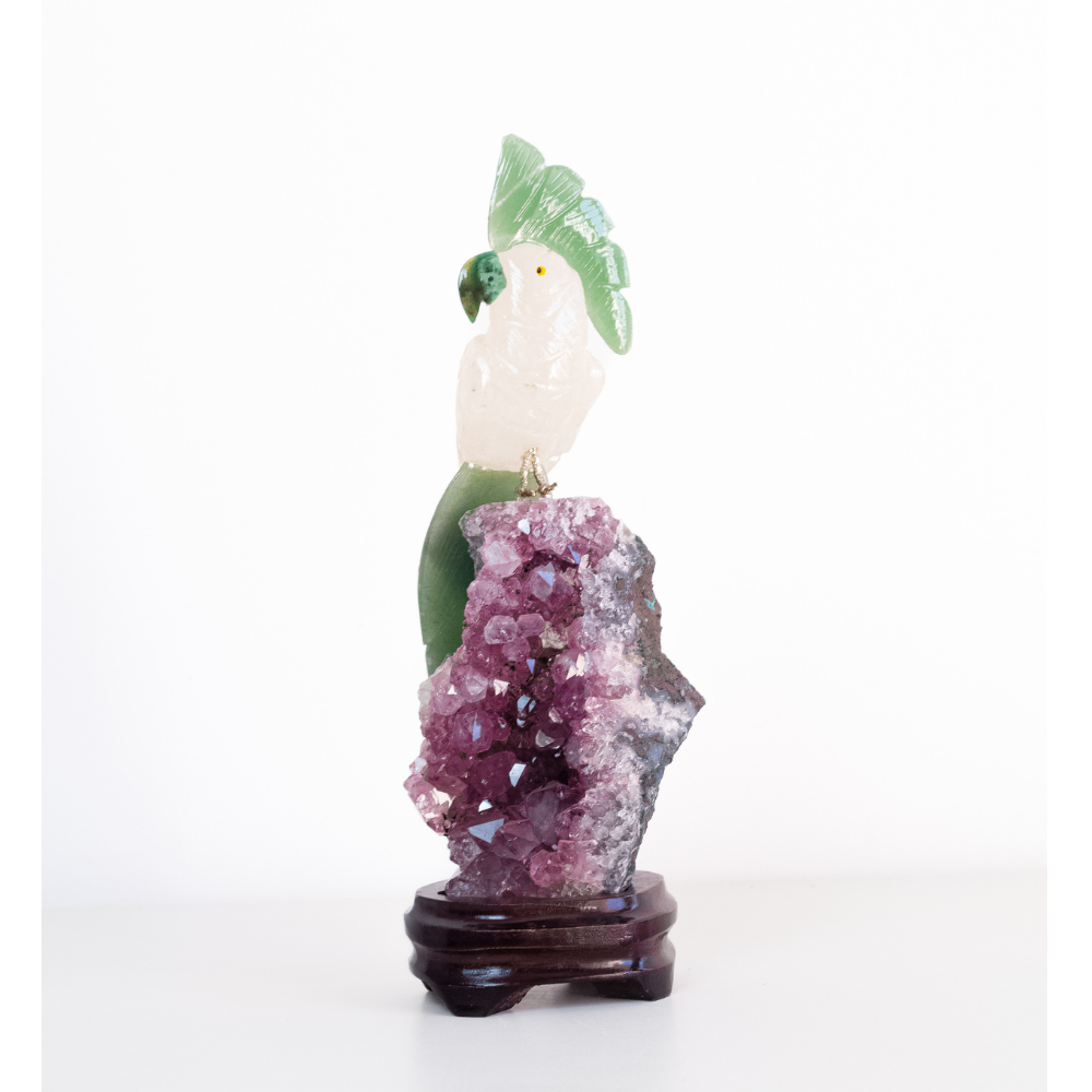 Pássaro Cacatua Quartzo Rosa e Quartzo Verde Base Drusa de Ametista