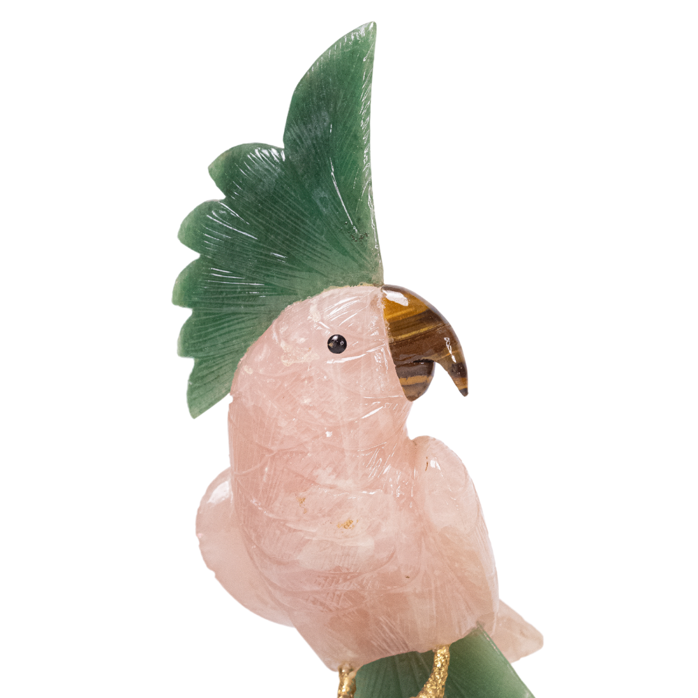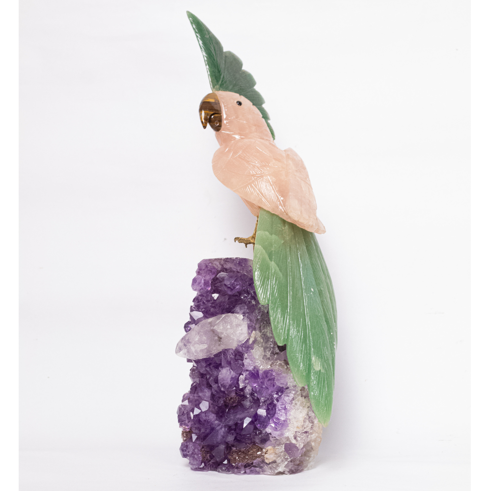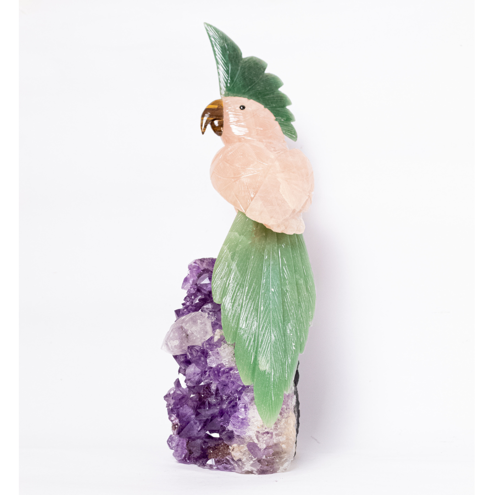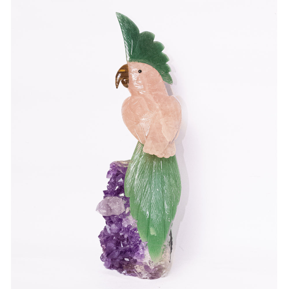 Pássaro Cacatua Quartzo Rosa e Quartzo Verde Base Drusa de Ametista